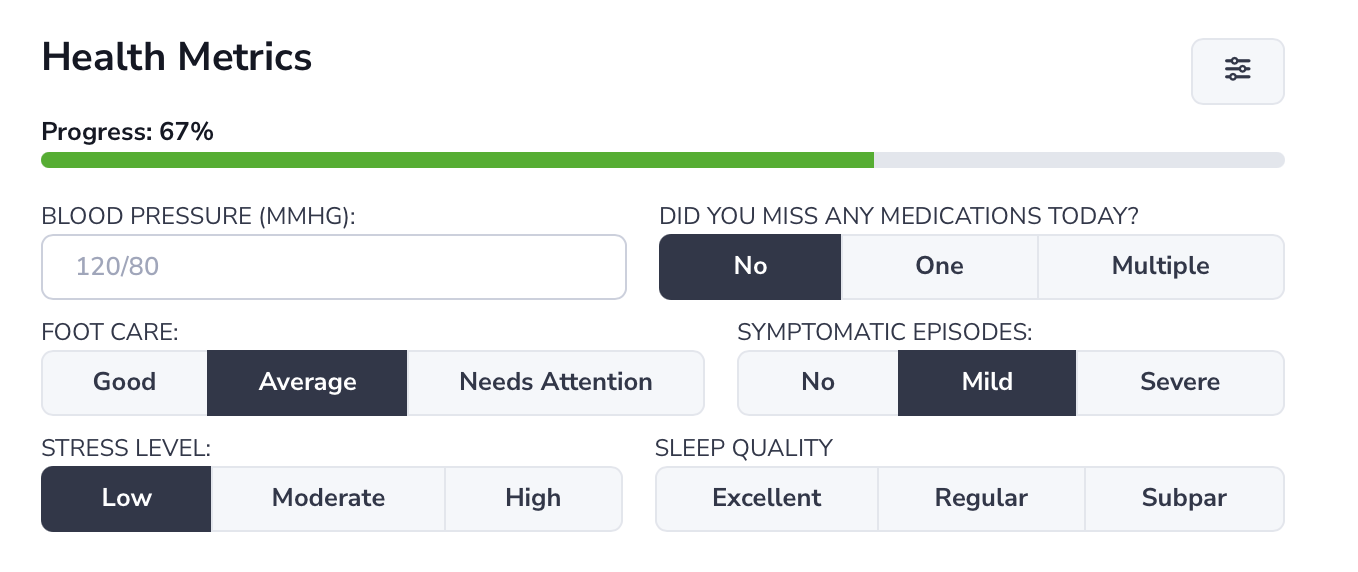 Dive into comprehensive insights with Health Metrics. From medications and blood pressure to foot care, symptomatic episodes, stress levels, and sleep quality — our holistic approach puts all your health data in one place for a 360-degree view of your well-being.