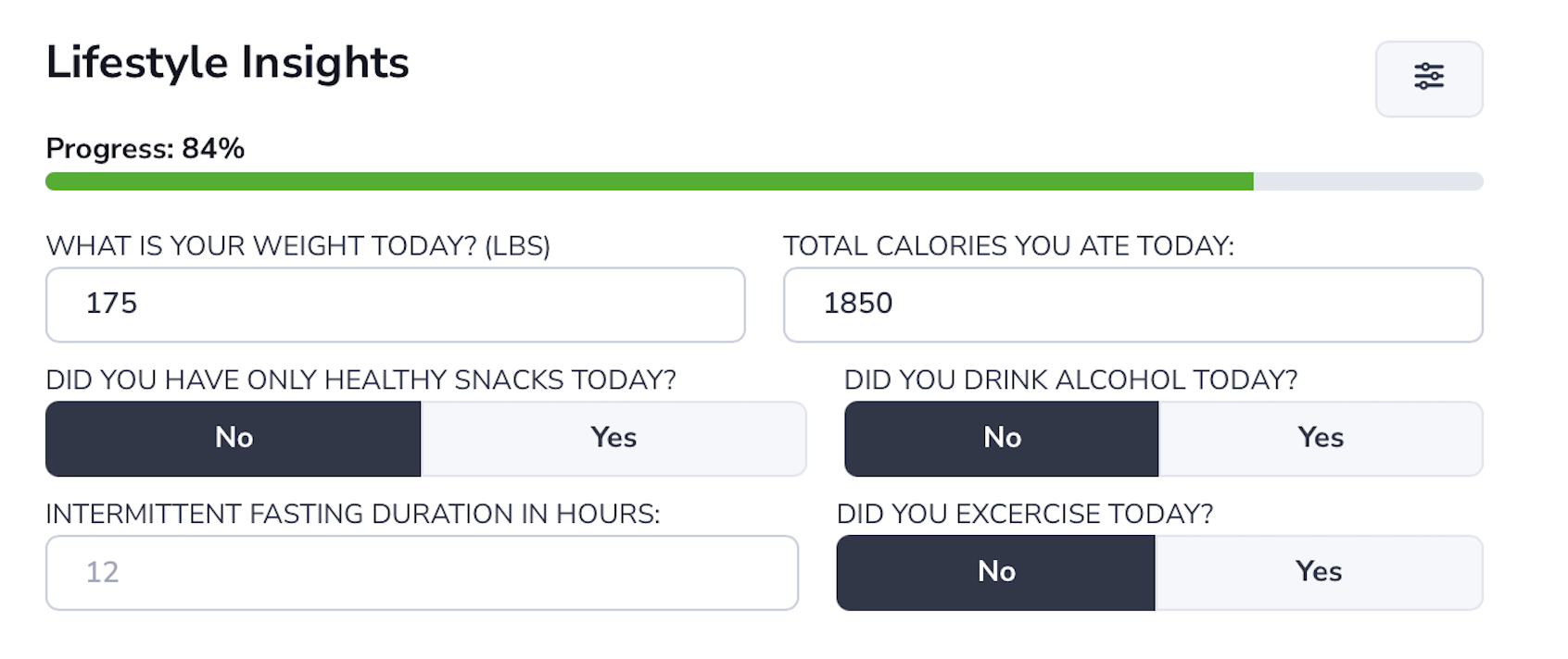 Unlock Lifestyle Insights for a well-rounded perspective on your health. Explore weight, calories, carbs, healthy snacks, alcohol intake, intermittent fasting, and exercise details — empowering you to make informed choices that align with your unique lifestyle goals.
